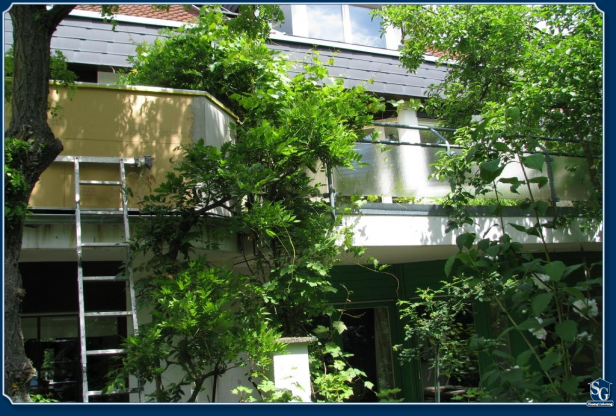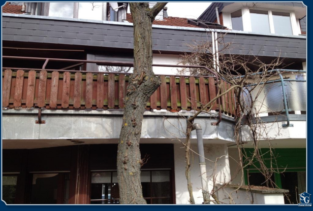 Ein marodes Geländer, dass bereits als Sichtschutz diente, jedoch die Montage einer Regenrinne verhindert
