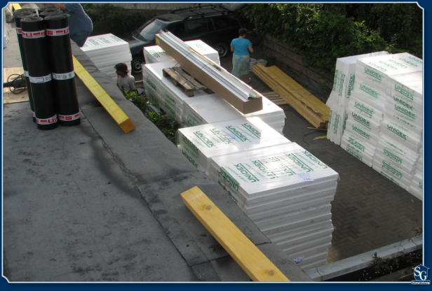 Bei einer Flachdachsanierung über einem Wohnbereich kommt unter die Abdichtung des Flachdaches ein Aufbau mit einer trittfesten Dämmung