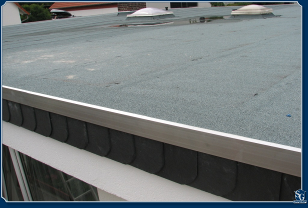 Die Erhöhung des Flachdaches, die jetzt durch den Aufbau mit der Dämmung erfolgt, kann man seitlich mit einer Verschieferung kaschieren