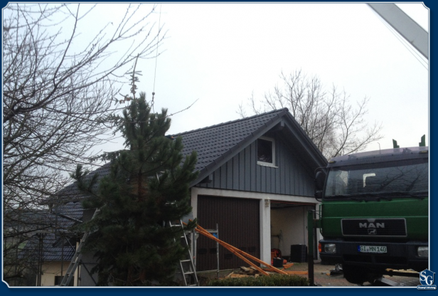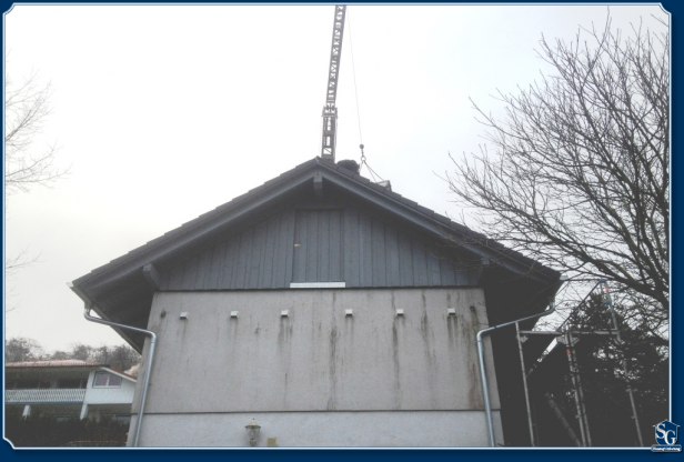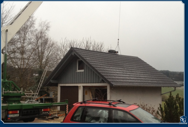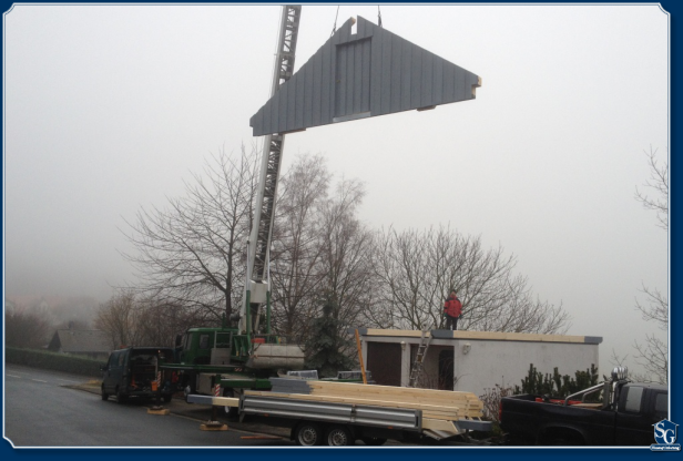 Das Dach wird in der Halle vorgefertigt (dadurch sind wir nicht wetterabhängig) und mit dem Kran montiert.
