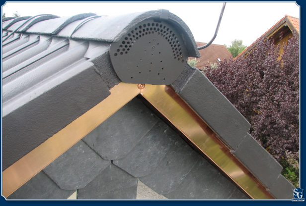 Wenn der Platz für eine Verschieferung unter dem Ortgangsstein nicht ausreicht, kann man hier auch mit einem Blech arbeiten: In diesem Fall Kupferblech
