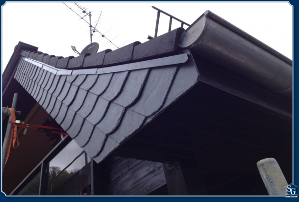 Hier eine konische Verschieferung mit beschichtetem Alublech (schieferfarben) als Z-Profil an den Ortgang angeschlossen