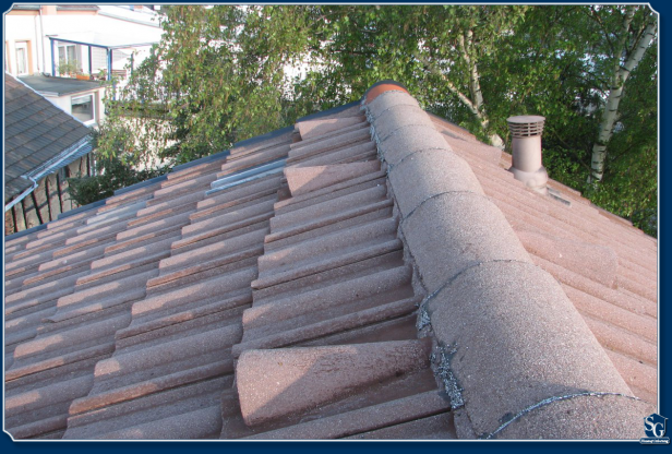 Das Dach wir mit reinem Wasser gereinigt, der Dachfirst kann mit einem dauerelastischem Kunststoffmörtel nachgemörtelt oder erneuert werden