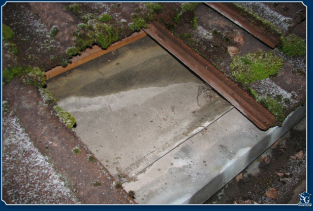 Wir haben einen Dachstein entfernt und man kann sehen, wie hier das Moos -wie ein Schwamm- die Feuchtigkeit in das Dachinnere transportiert