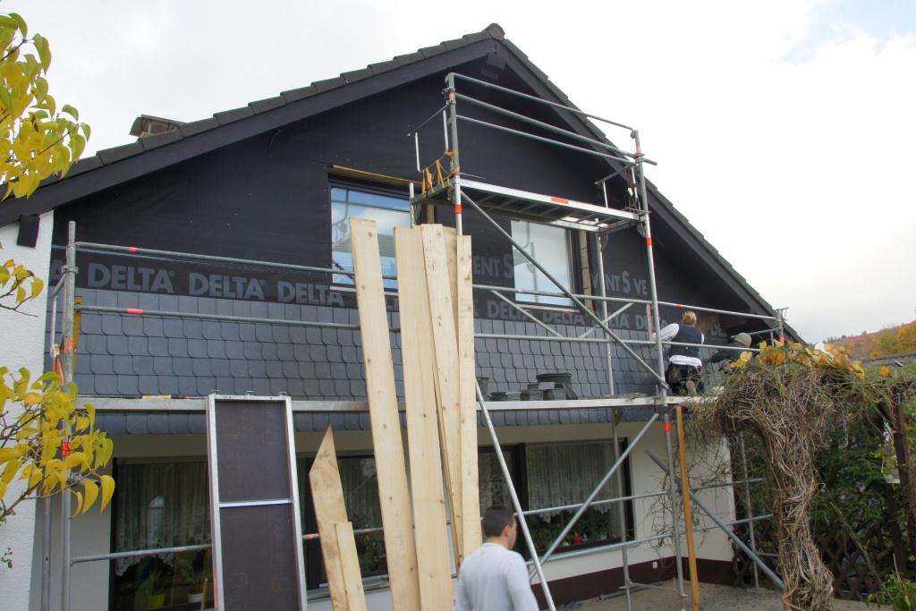 Viele möchten gerade am Giebel, der meistens vom Wetter stark beansprucht ist, einen Dauerschutz haben, nie wieder streichen oder Gerüst stellen usw. Da bietet sich die Fassadenverkleidung an. Wetterfeste Hölzer, Kunstoffprofile in allen Arten und Formen oder Naturschiefer. In diesem Zuge kann man auch eine Dämmung einbauen, die von uns auch kombiniert werden kann mit gedämmten verputzten Flächen.
