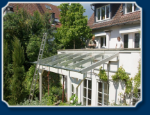 Überdachung! Alternativ hätte man die Holzfenster erneuern müssen und mit Aluminium-Wetterschenkeln versehen, die Platten aufnehmen müssen usw.