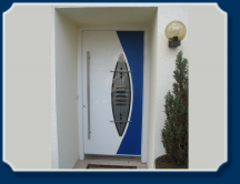 Eine thermisch getrennte Aluminiumtür, pulverbeschichtet, Glasmotiv, Applikationen in blau und in Edelstahl
