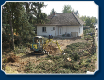 Tag 1: Es geht los. Wurzelstubben werden gerodet, um das Gelände zu planieren.