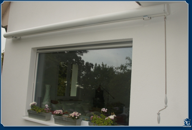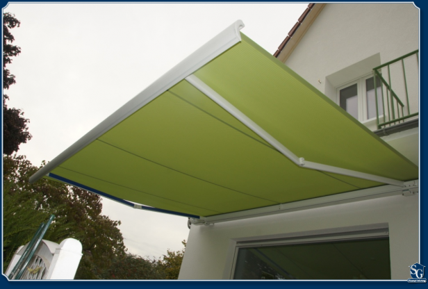 Hier die Vollkassetten-Markise in geschlossenem Zustand, Farbe wählbar, Antrieb elektrisch oder mit Kurbel