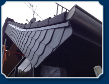 Hier eine konische Verschieferung mit beschichtetem Alublech (schieferfarben) als Z-Profil an den Ortgang angeschlossen
